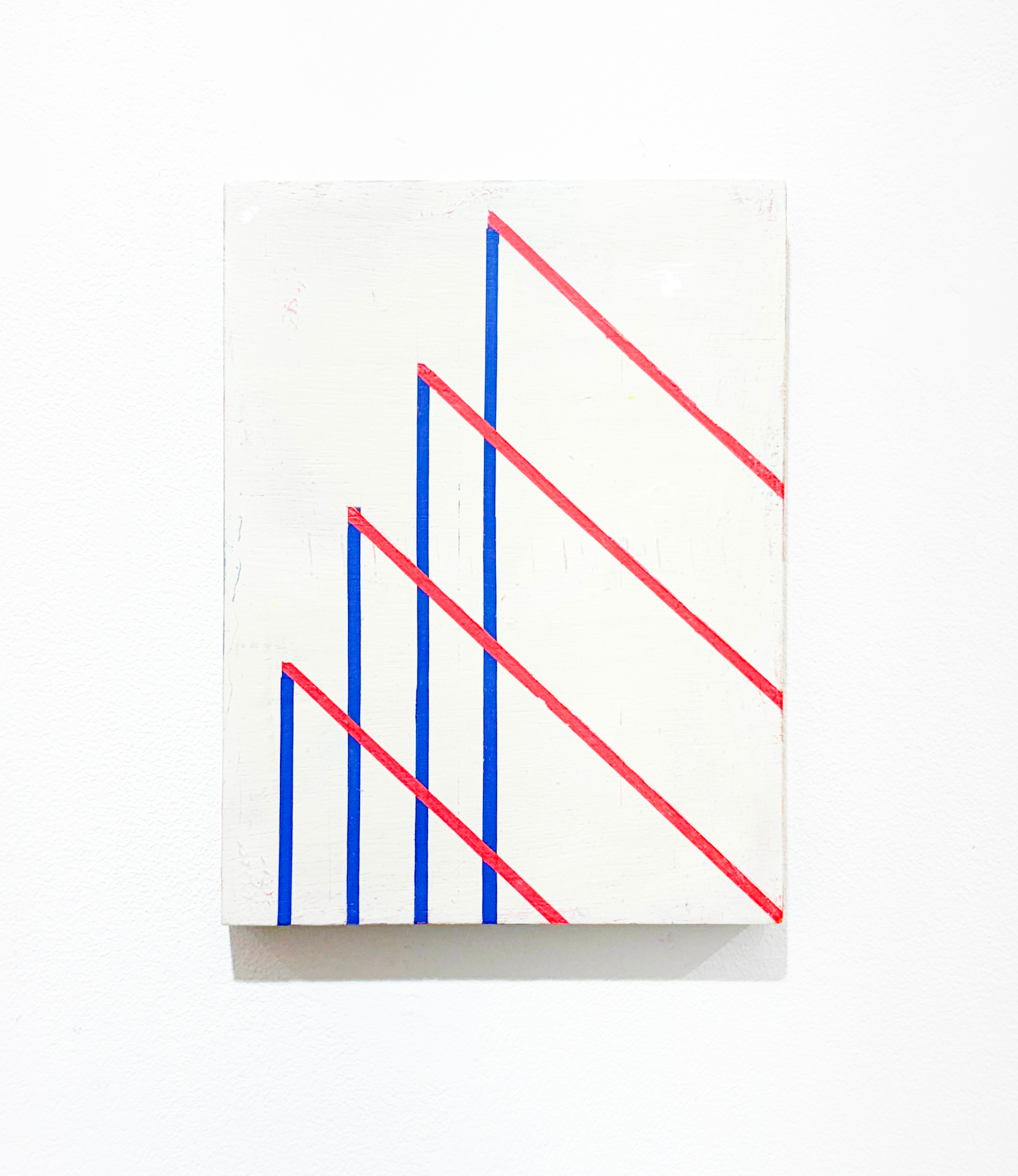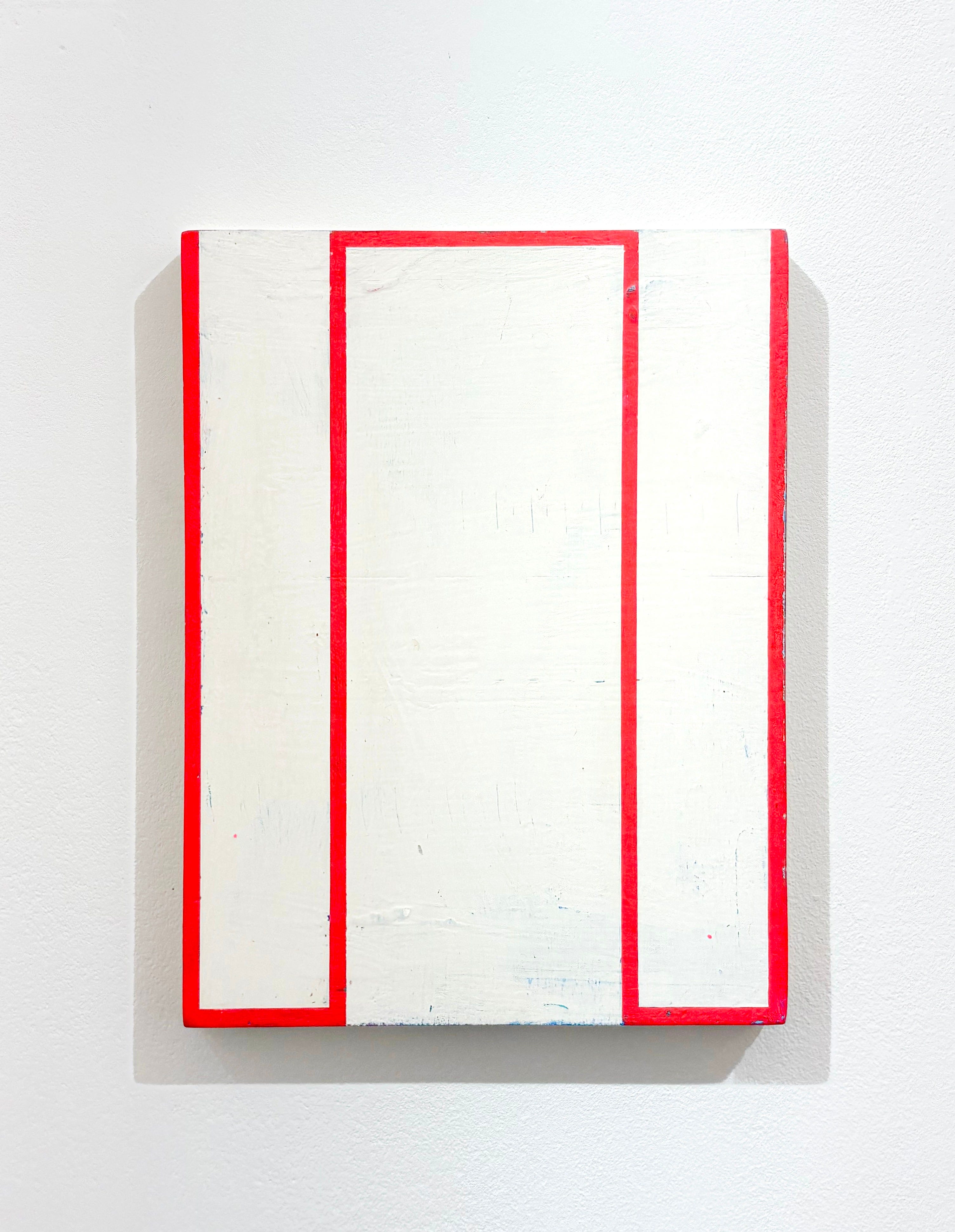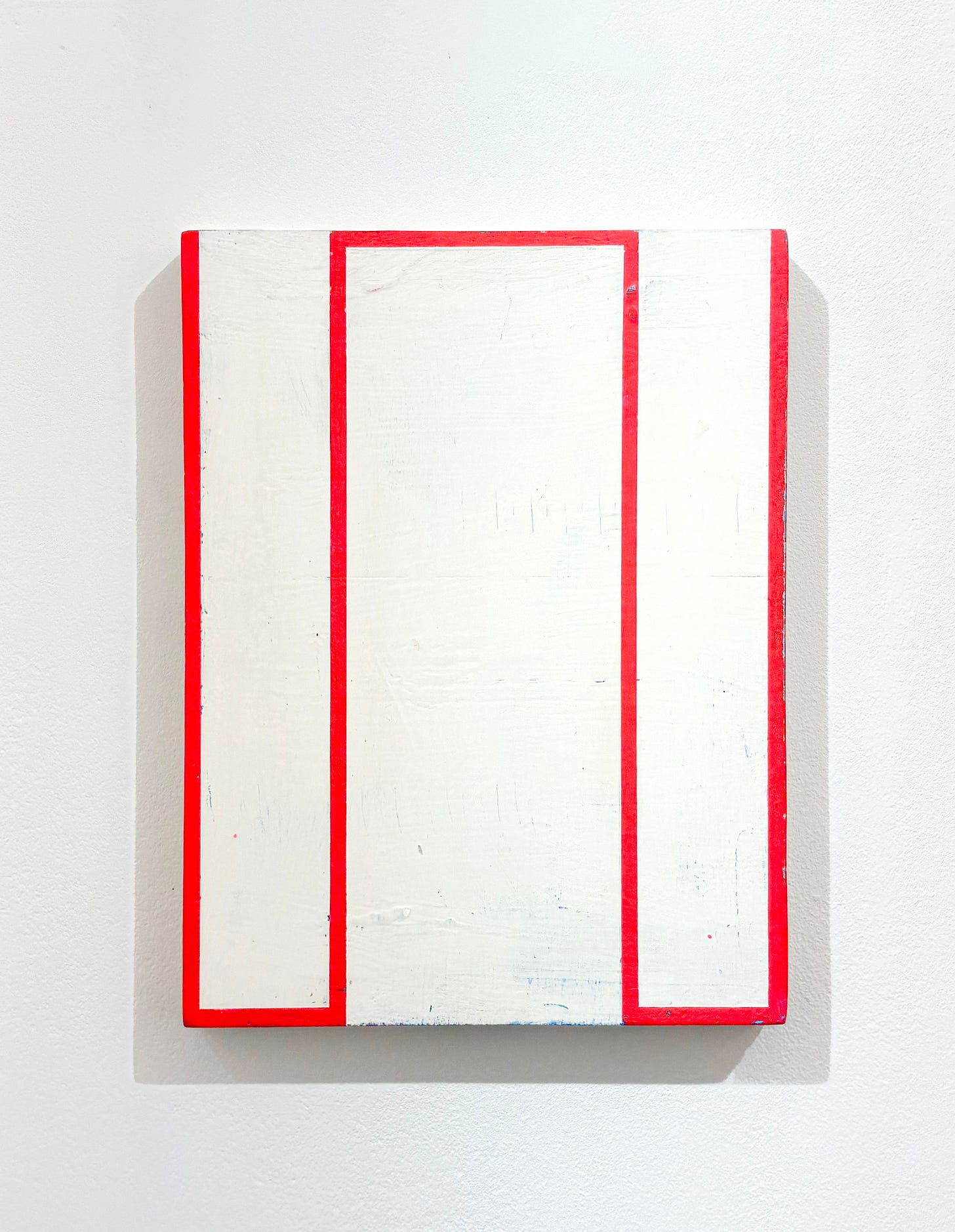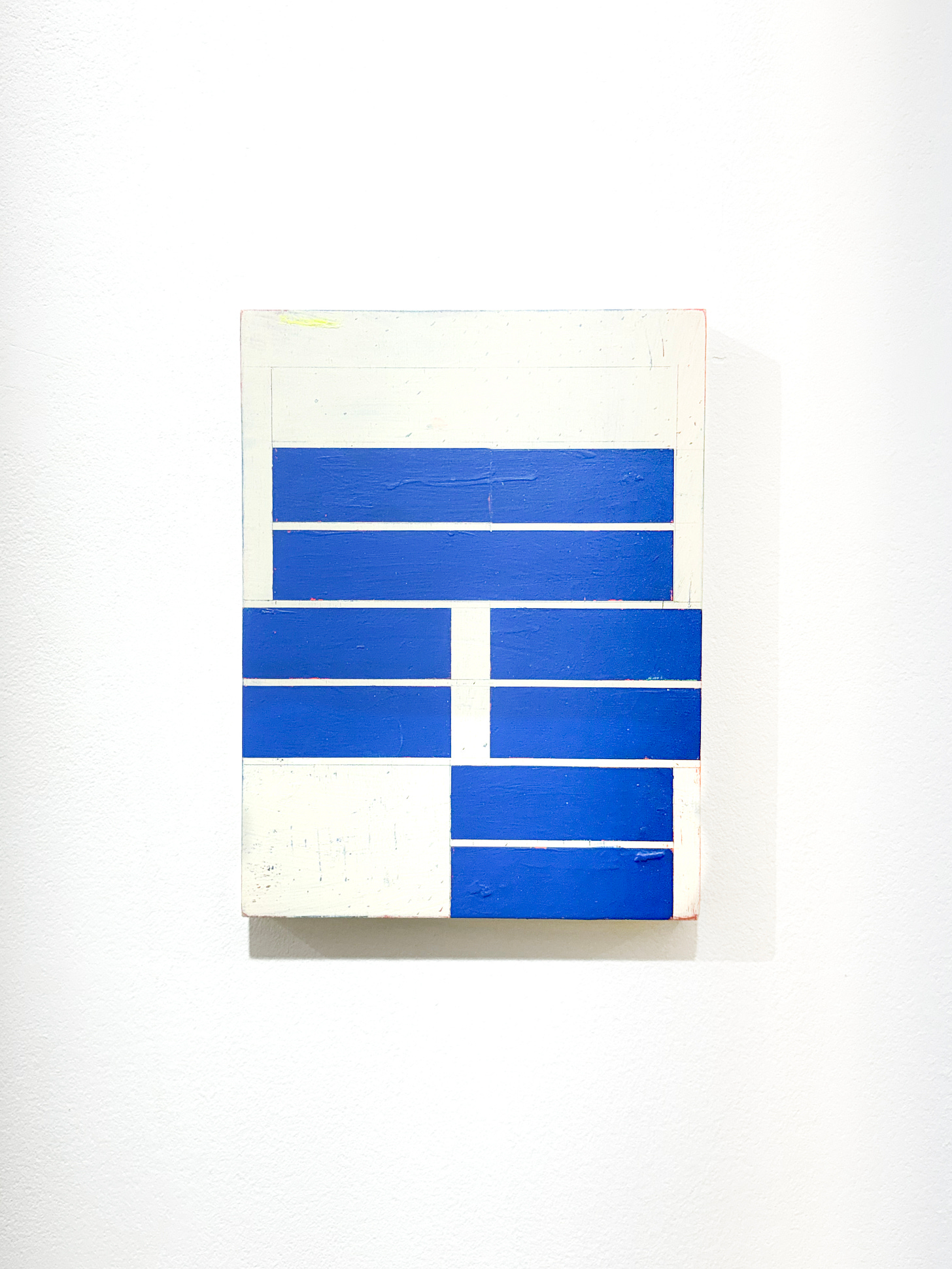 Les œuvres sont peintes sur des panneaux de bois épais, et cette épaisseur — environ deux centimètres — est essentielle. Les peintures ont une présence presque sculpturale ; ce sont des objets autant que des images. On sent un artiste qui joue réellement, qui explore, qui se demande jusqu’où il peut aller avec très peu de moyens. Aucun désir manifeste d’appartenir à un courant, aucune froideur analytique. Ce qui s’impose, c’est la curiosité, le plaisir et une intelligence visuelle très libre.
