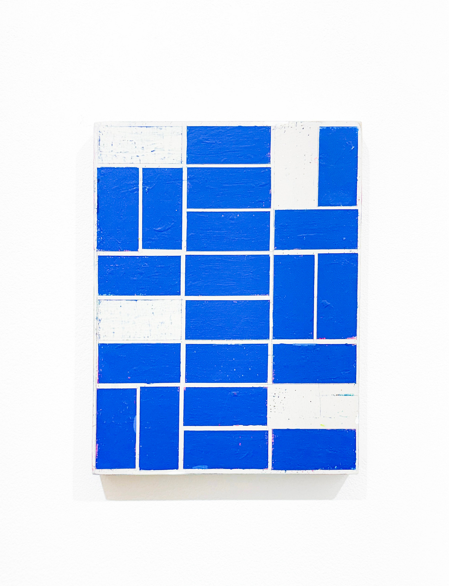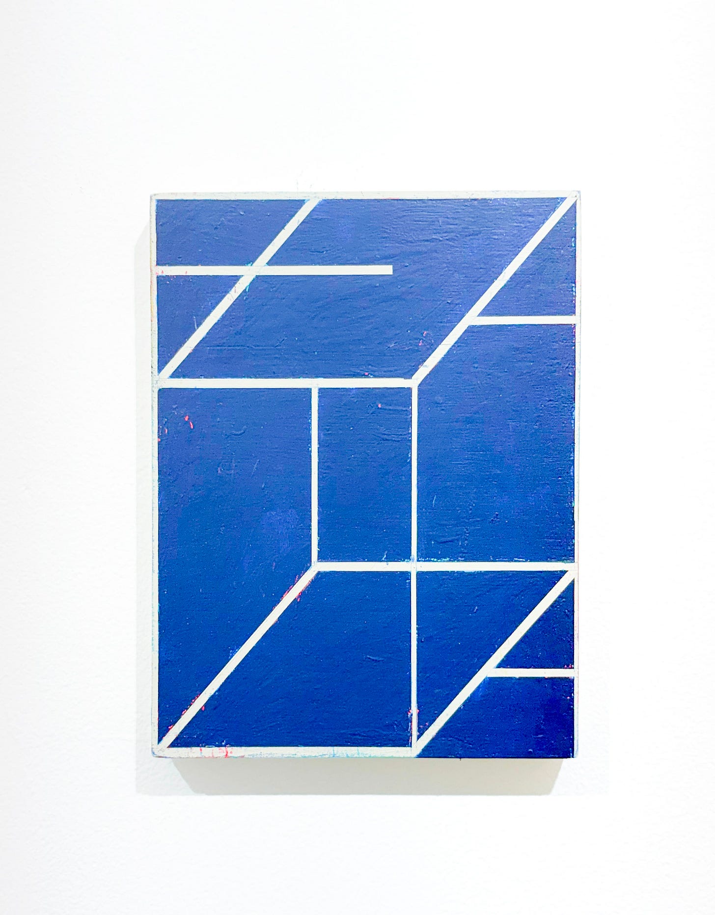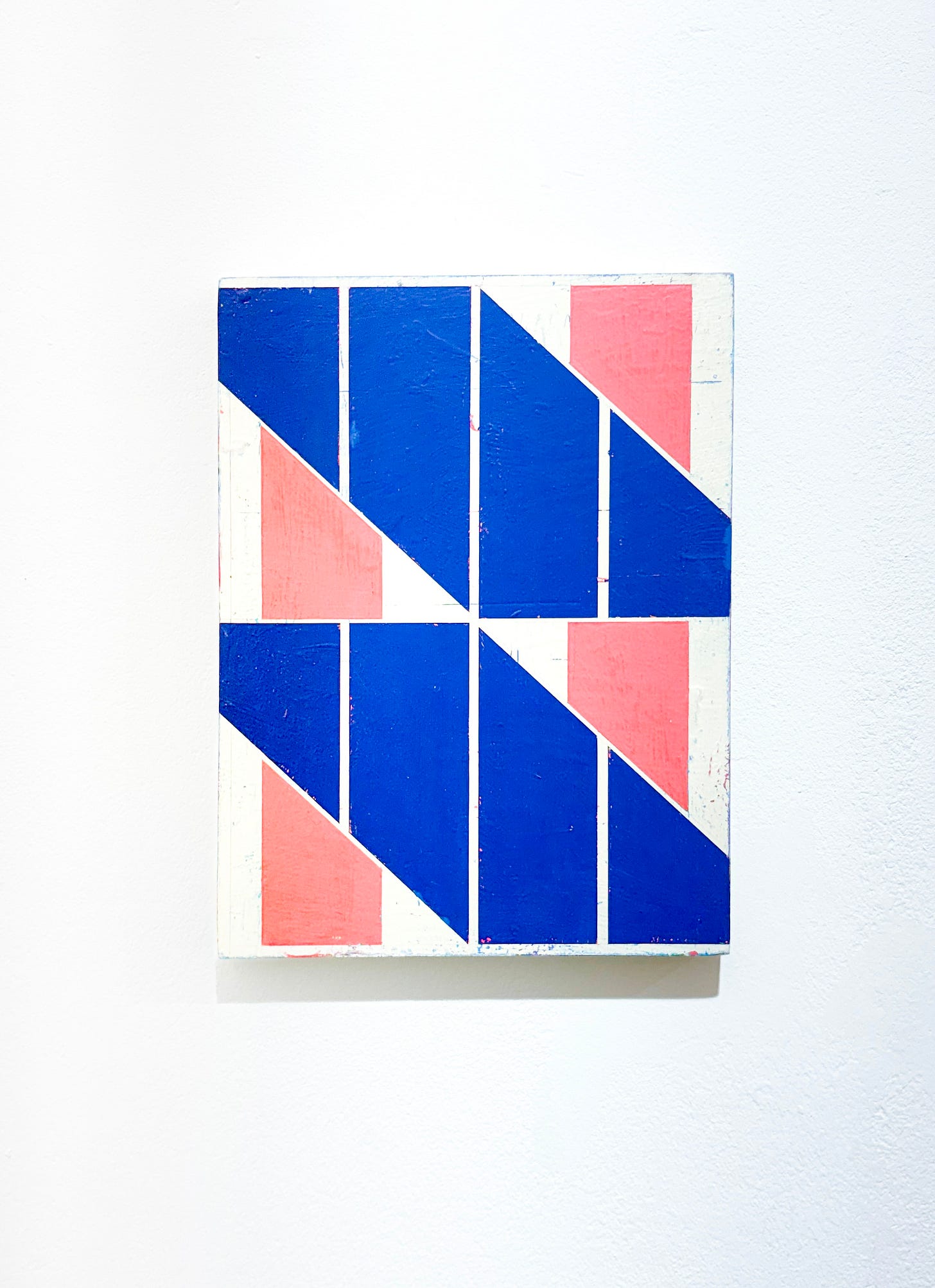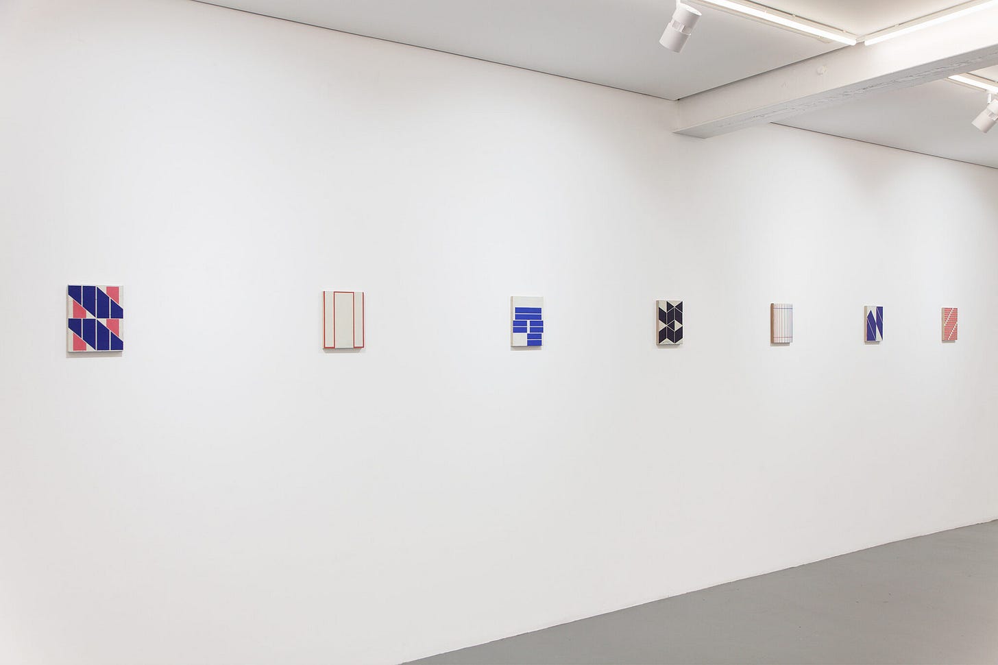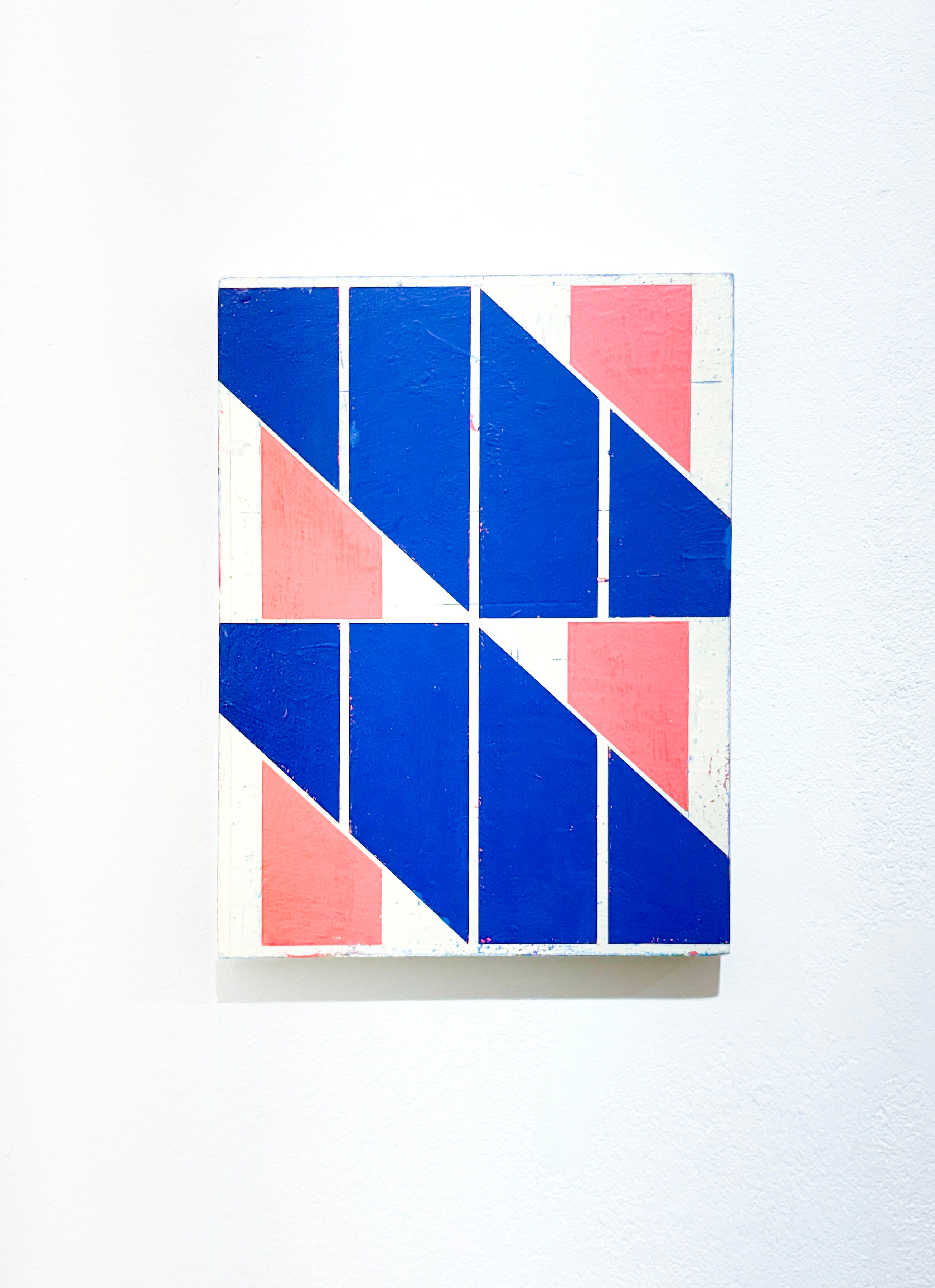 Le dispositif paraît presque radical : des formats très réduits (environ 23 × 18 cm), une géométrie rigoureuse et une palette volontairement restreinte. Autant de contraintes qui, bien souvent, finissent par lisser un ensemble de œuvres en variations sages et prévisibles. Ici, c’est exactement l’inverse. Chaque pièce est plus vive, plus fine, plus inventive que la précédente. Chaque peinture est une découverte en soi, un petit feu d’artifice visuel : compact, précis, mais chargé d’idées. À peine a-t-on le sentiment d’avoir fait le tour du possible qu’une nouvelle œuvre relance le jeu.