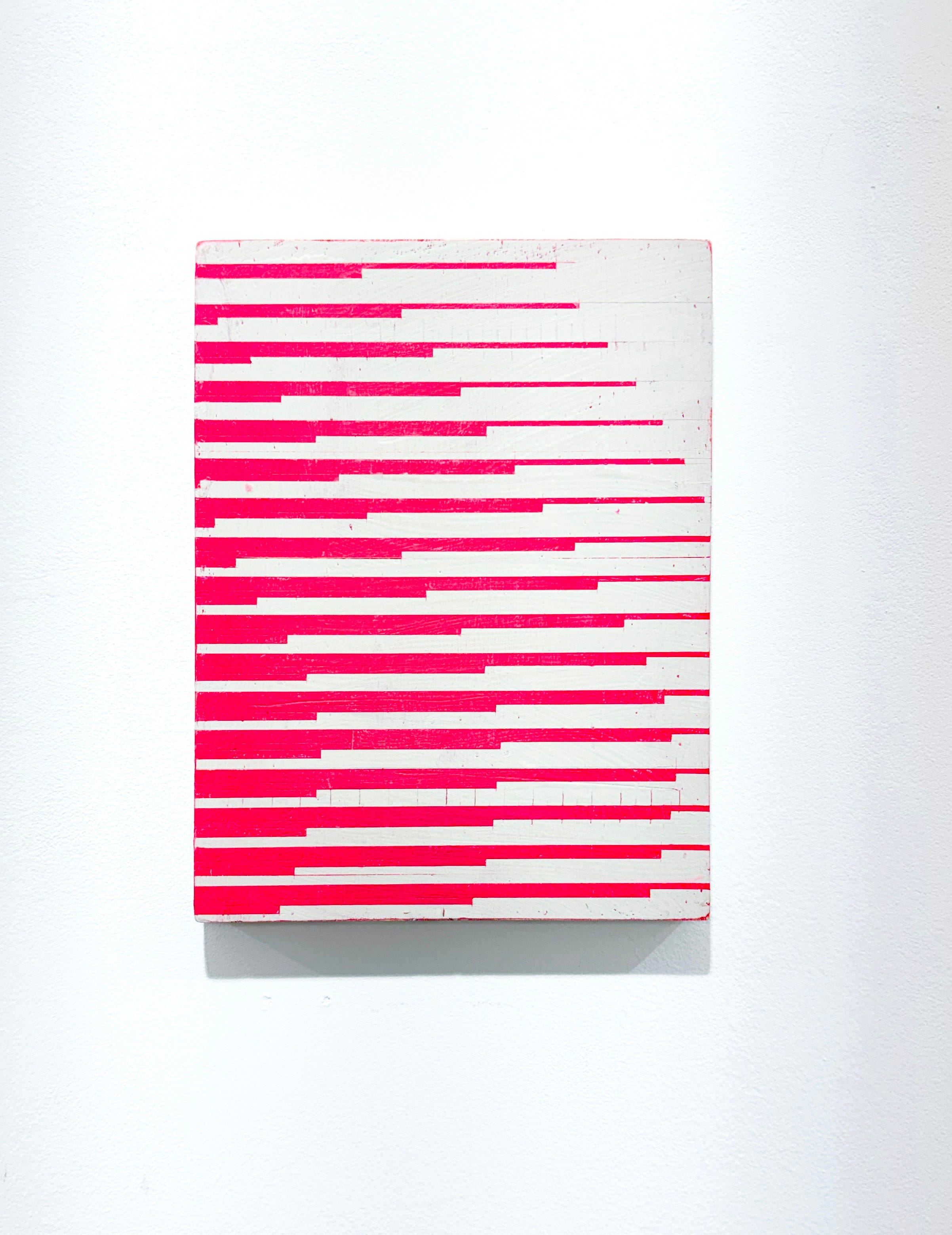 The works are painted on thick wooden panels, and the depth—about two centimeters—really matters. The paintings feel almost sculptural, like objects rather than images. You sense an artist genuinely playing, asking himself how far he can push reinvention with minimal means. There’s no visible desire to belong to a specific movement, no cold mathematical rigidity. What comes through instead is curiosity, pleasure, and intelligence.